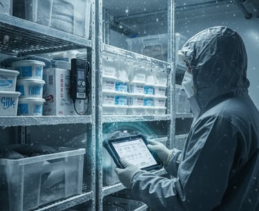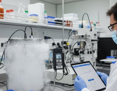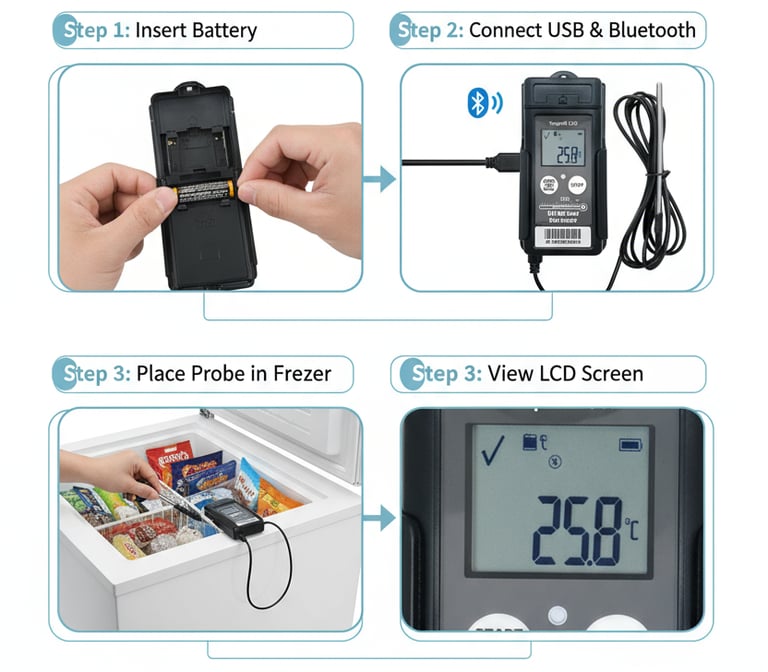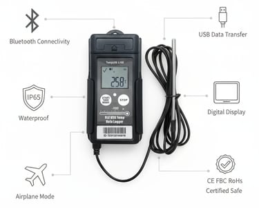 Used for vaccine cold chain monitoring, biologics, and clinical trial temperature tracking with dry ice. Ensures FDA-compliant logging and Bluetooth data access for pharma logistics.
