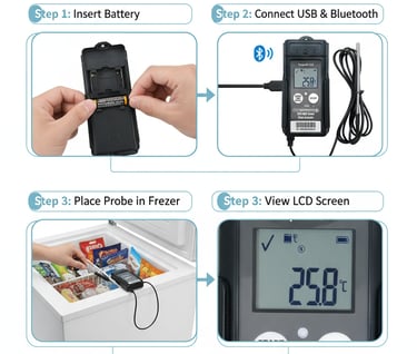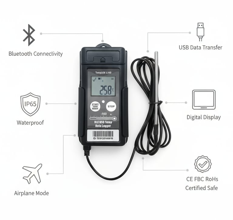 Ideal for blood bank temperature monitoring, organ transport, and medical cold storage. Features LCD display, USB connectivity, and flight mode for hospital use.