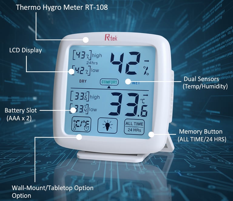 The RT-108 Thermo Hygro Meter is a compact, digital device designed to measure ambient temperature and relative humidity with precision. Featuring a clear LCD display and intuitive controls, it’s widely used in both domestic and professional environments for climate regulation and data logging.