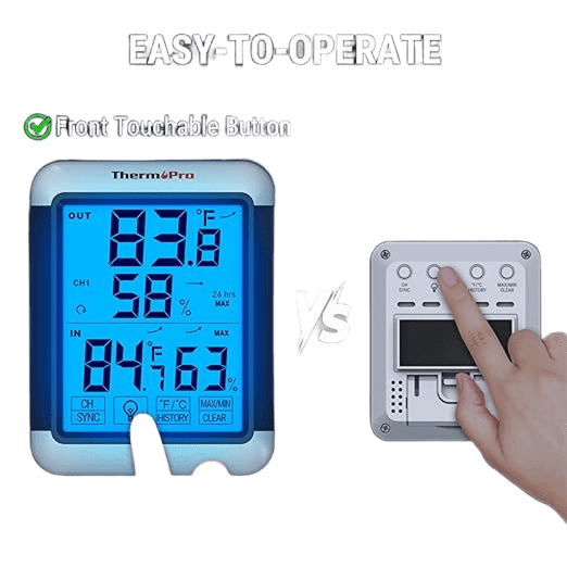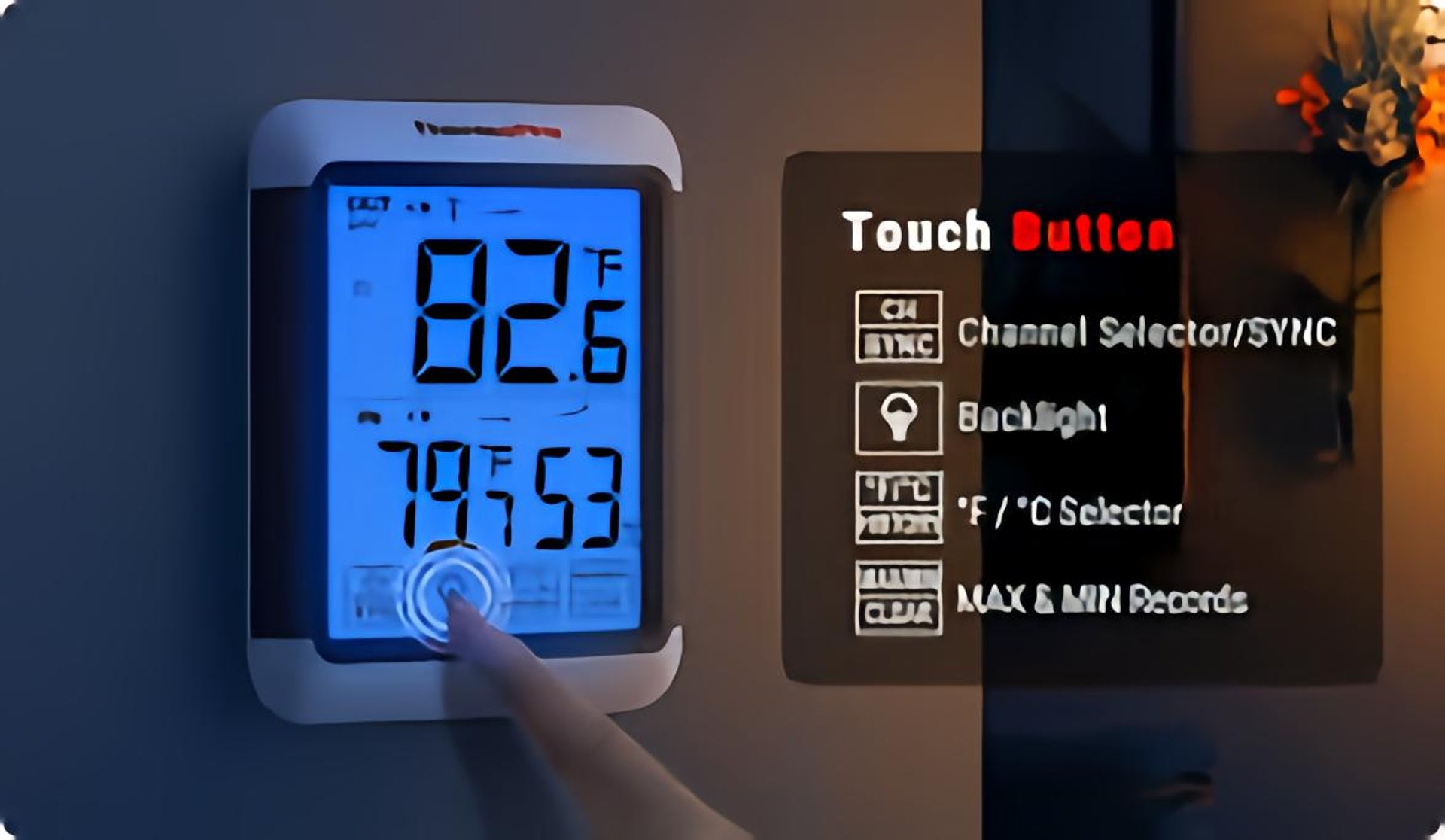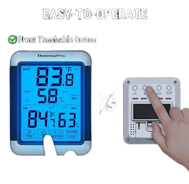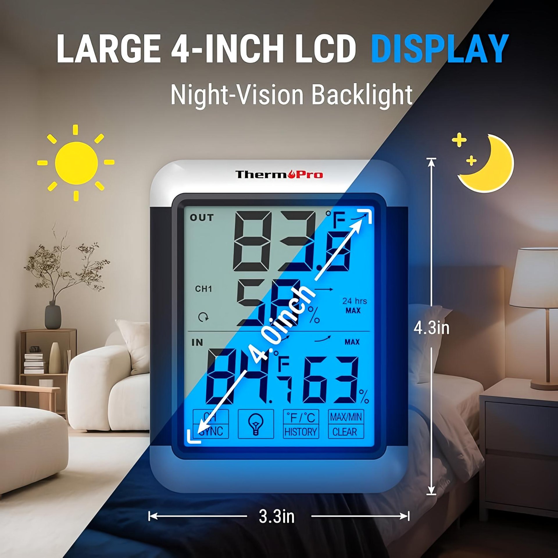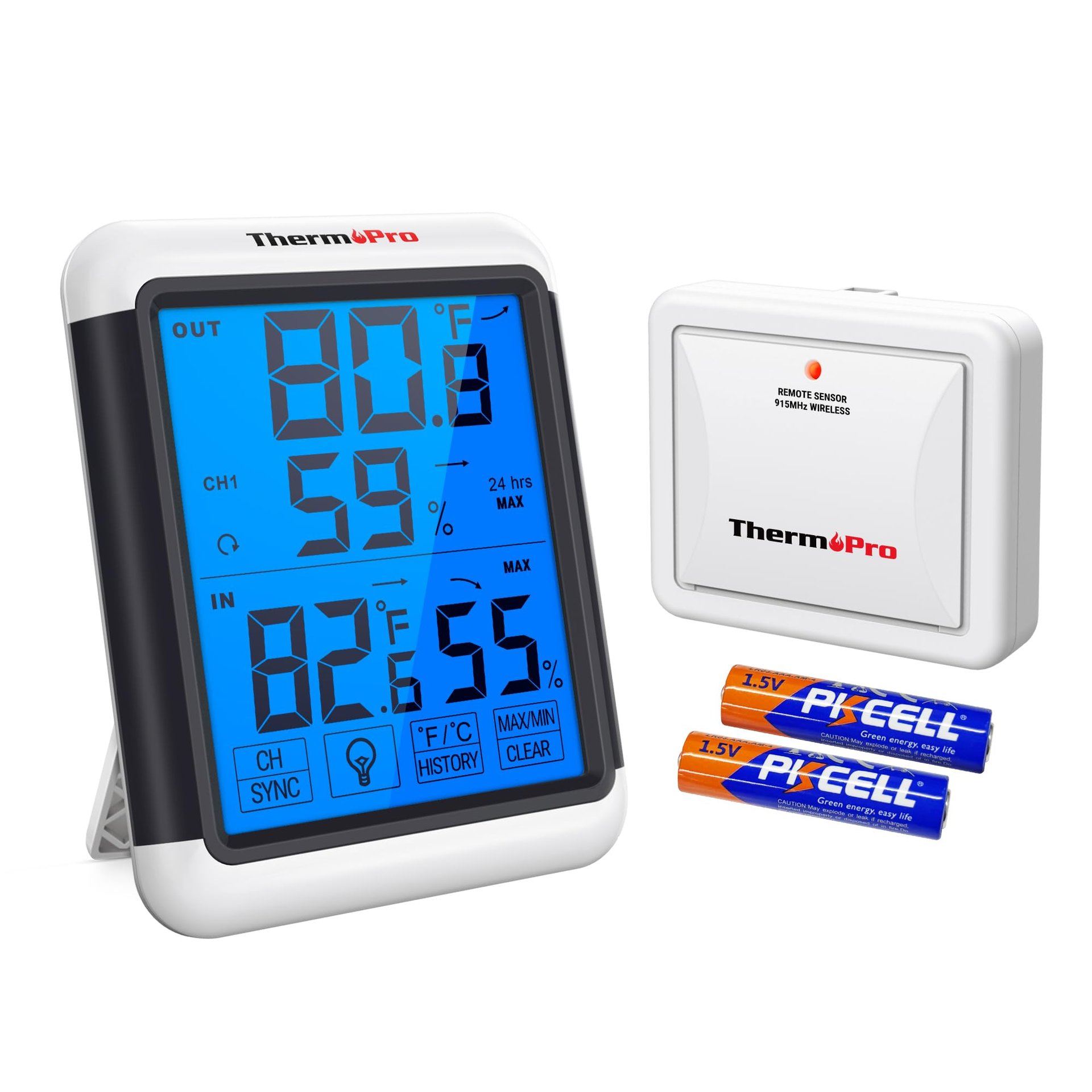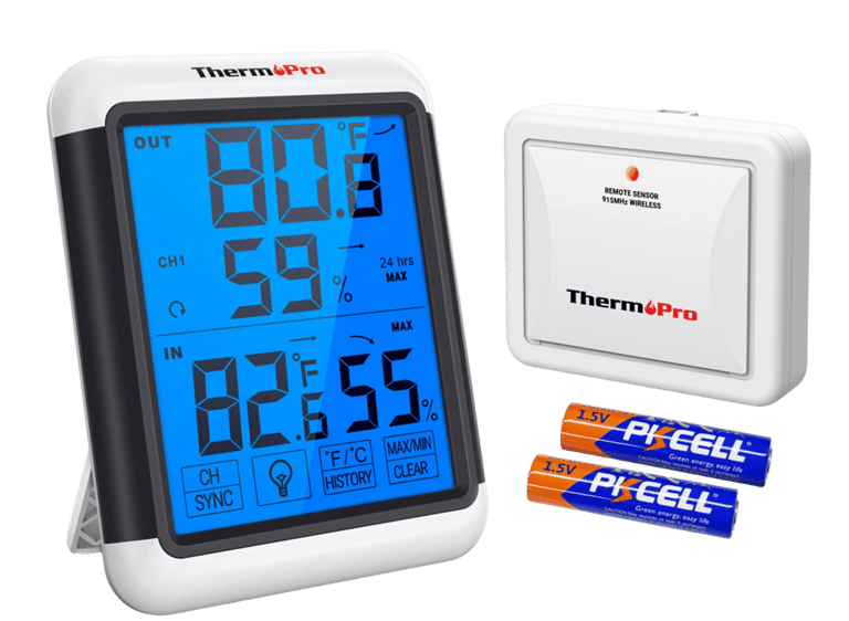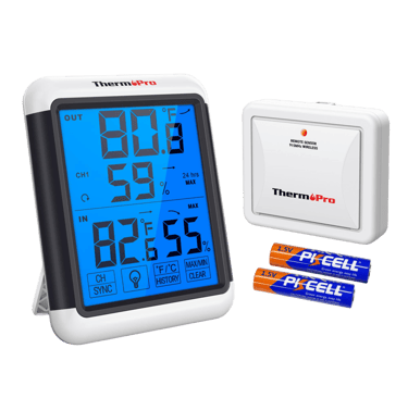 The ThermoPro TP65 is a wireless indoor and outdoor thermometer and hygrometer with a large, backlit touchscreen display. Designed for home use, the device helps you monitor temperature and humidity levels inside and outside your house.