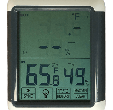 Arrows on the display show whether the temperature and humidity are rising, falling, or staying the same.